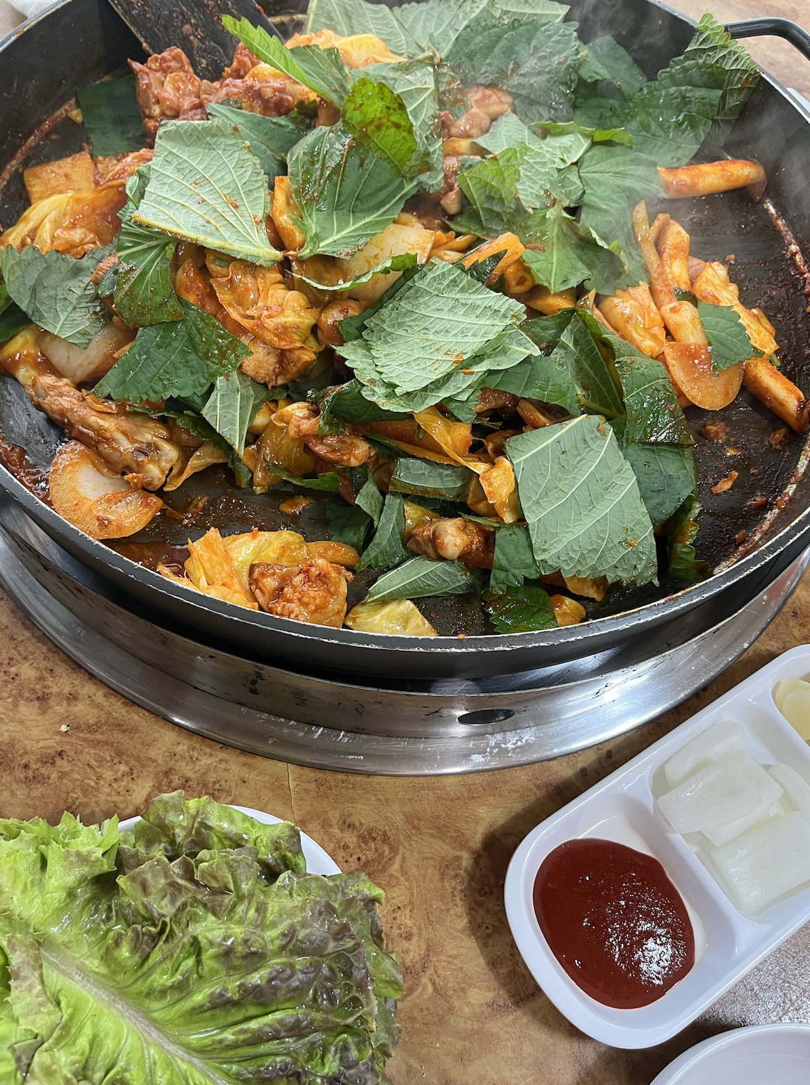 처음엔 닭고기만 불판에 얹어서 굽다가 양배추, 파, 떡, 고구마 등의 야채를 함께 섞어주신다. 마지막엔 깻잎이 흩뿌려지며 조리가 끝난다.